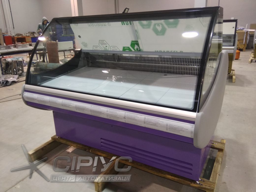 Данное оборудование производится со встроенным агрегатом, фронтальным гнутым каленным стеклом. Панель управления оснащена термоконтроллером Carel с функцией автоматической оттайки. Для более ефективной работы - оборудование произведено с двумя тенами, что имеет огромное преимущество на ряду с подобными витринами других производителей. Демонстрационная часть и полка продавца сделаны из нержавеющей стали. Шторки из оргстекла, стационарная розетка - 220 В. Корпус - из крашеного оцинкованного металла 0,65 миллиметров с пенополиуретановым заполнением.