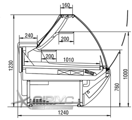 Нижня викладка зроблена у вигляді висувного піддону з боку продавця, щоб полегшити розстановку кондитерських виробів всередині вітрини.