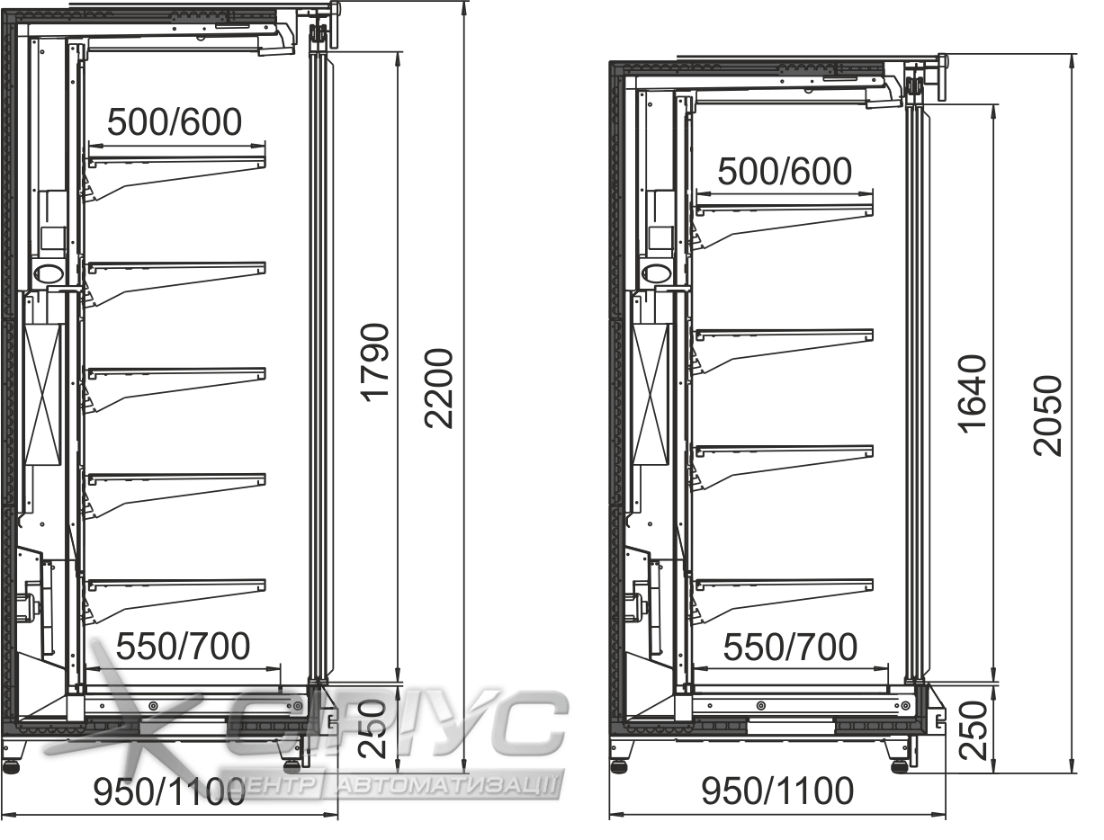 - Виконання гірки тип "м'ясна" (чорний колір обсягу, ТЕНова розморожування випарника): 1250 мм, 1875 мм, 2500 мм, 3750 мм;