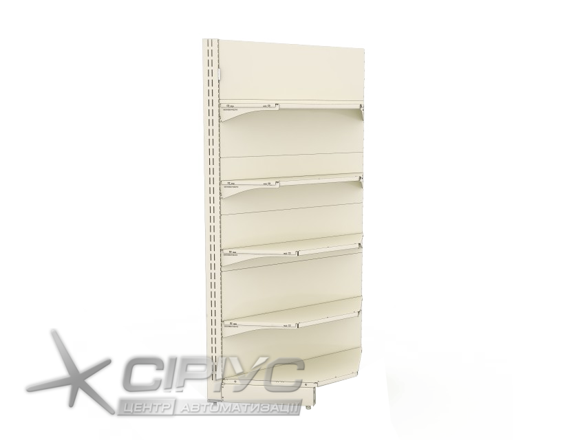 Кутовий стелаж комплектується так як і сусідні з ним секції торгового устаткування. Доповнюючи обладнання, даний стелаж виконує дуже важливу функцію - створює завершену композицію торгового ряду.
